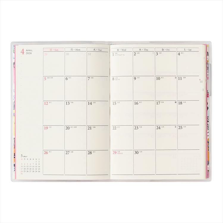 【月間ページ】見開き1ヵ月のベーシックなブロックタイプ(日曜始まり)。カレンダーと同じような感覚で見ることができ、月ごとの予定が把握しやすいのが特長です。