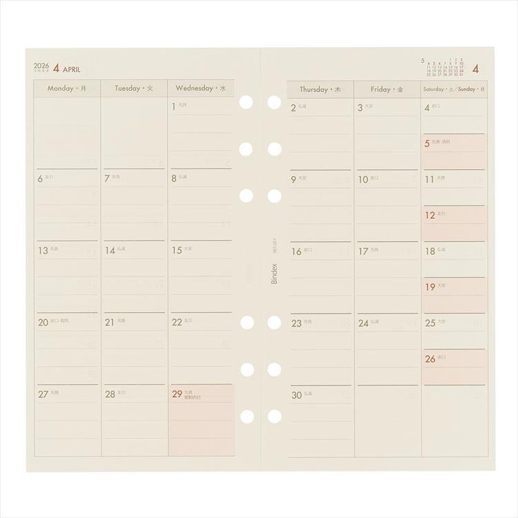 - 2025年11月始まりシステム手帳用リフィル バイブル 月間ダイアリー5 カレンダータイプ