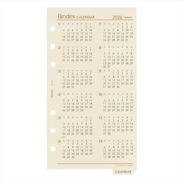 長年愛されているブランド、Bindex by NOLTY (バインデックス バイ ノルティ)のバイブルサイズシステム手帳用年間カレンダー。切り込み入りで取る・付けるが簡単。