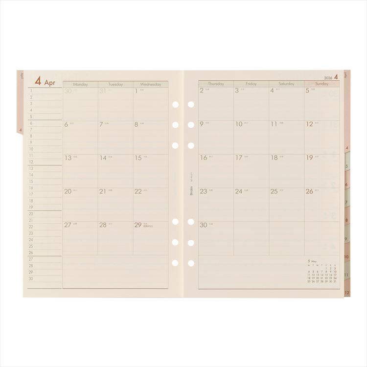 2026年1月始まりシステム手帳用リフィル A5 月間&週間ダイアリー1 レフトタイプ