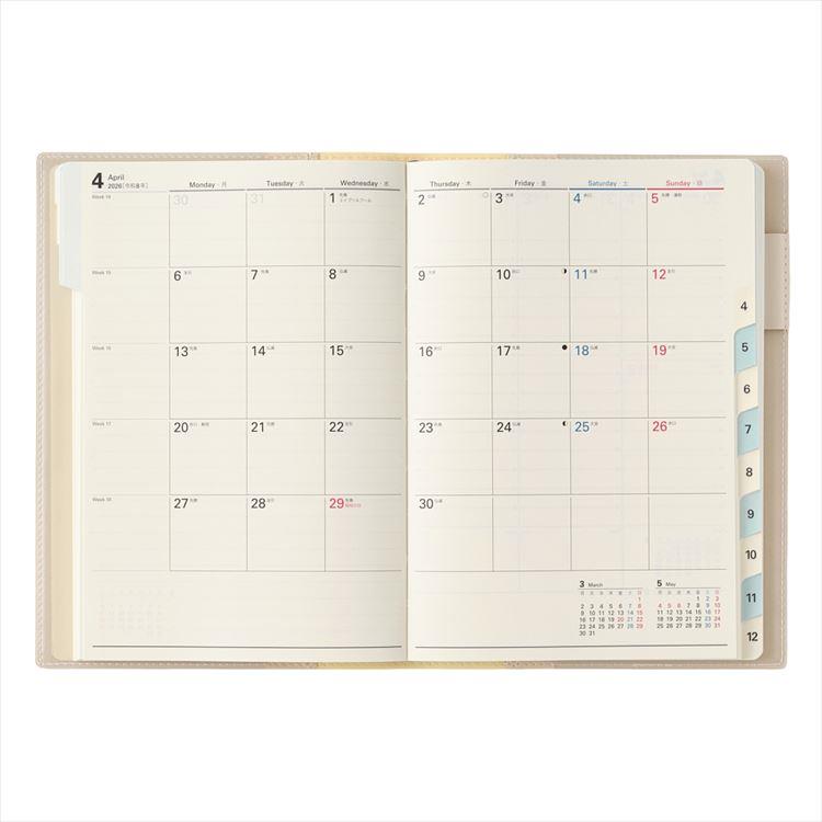 【月間ページ】見開き1ヶ月のベーシックなブロックタイプ(月曜始まり)。カレンダーと同じような感覚で見ることができ、週ごとの予定が把握しやすいのが特徴です。