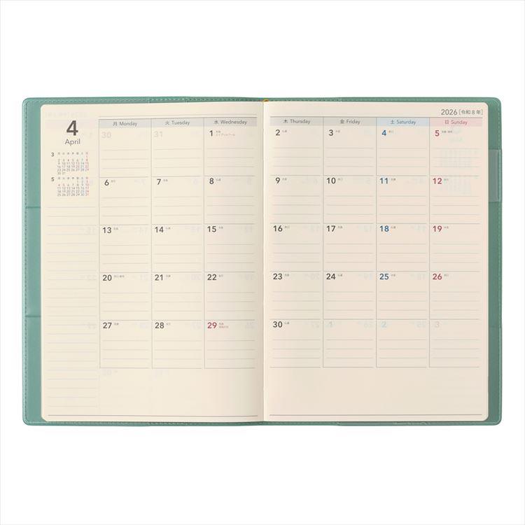 【月間ページ】見開き1ヶ月のベーシックなブロックタイプ(月曜始まり)。カレンダーと同じような感覚で見ることができ、週ごとの予定が把握しやすいのが特徴です。