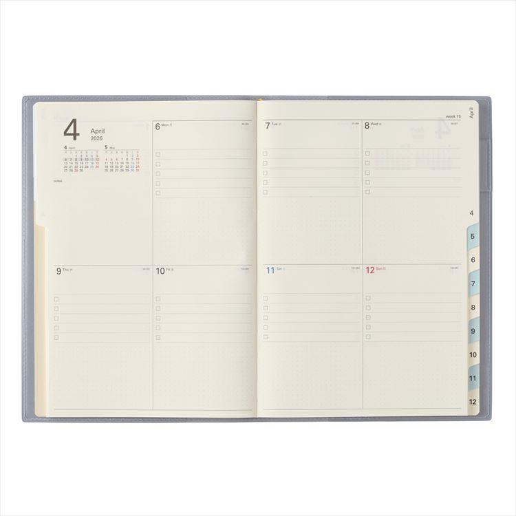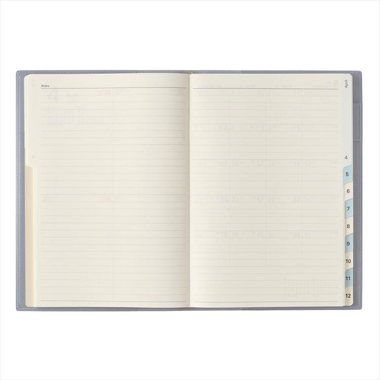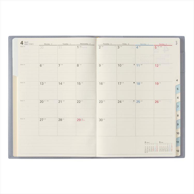 月間と週間が連続したページ構成で、月ごとにまとめて予定を組むのに適しています。