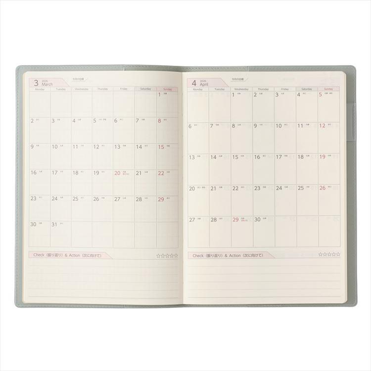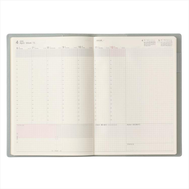見開き1週間で空き時間がわかりやすい方眼バーチカルタイプで余白もたっぷりあり、打ち合わせの内容やアイデアを書き込めます。