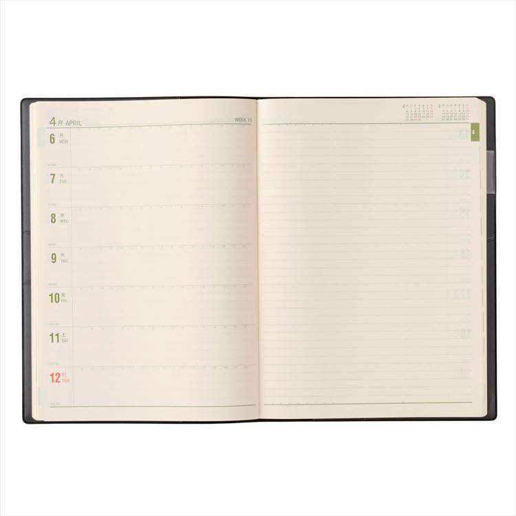 【週間ページ】見開き1週間で左ページに予定、右ページはメモスペースとして使えるレフトタイプ(月曜始まり)。