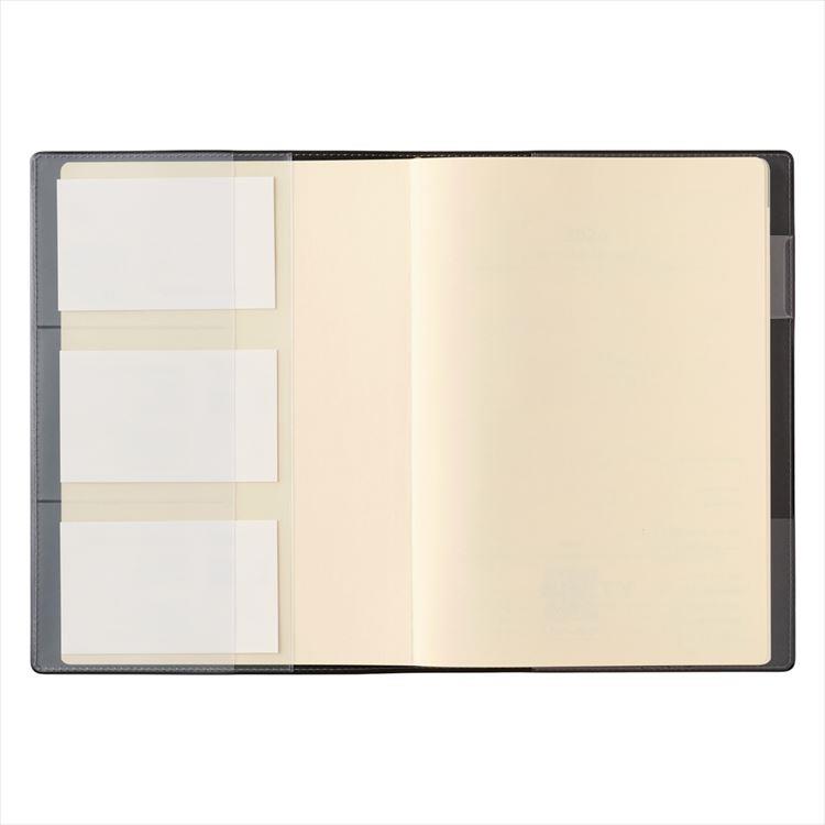 カバー前側には3段名刺ポケット、カバー後ろ側には名刺ポケット・ペンホルダーがついています。