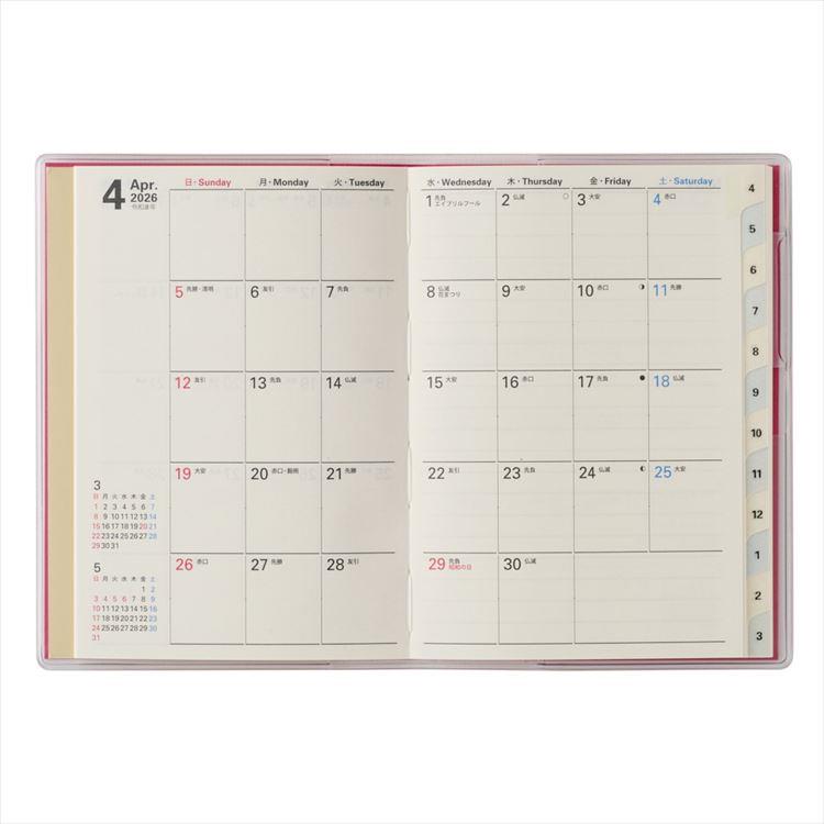カレンダー感覚で月ごとの予定が把握しやすいのが特徴で、見たいページをパッと開けるインデックス付き。