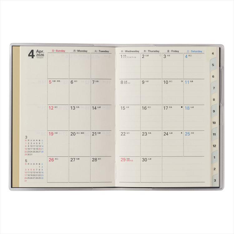 カレンダー感覚で月ごとの予定が把握しやすいのが特徴で、見たいページをパッと開けるインデックス付き。