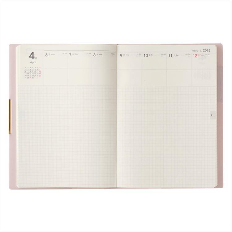 【週間ページ】上部のスケジュール欄(月曜始まり)で予定を把握しながら、たっぷりの方眼メモスペースはノートのように使えます。手帳とノートを一元管理したい方や自由にカスタマイズしたい方におすすめです。