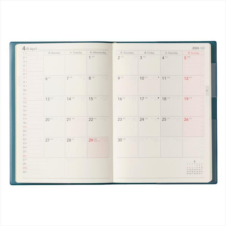 【月間ページ】見開き1ヶ月のベーシックなブロックタイプ(月曜始まり)。