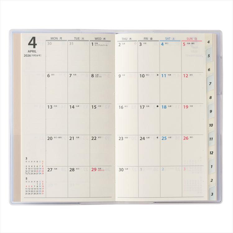 カレンダー感覚で月ごとの予定が把握しやすいのが特徴で、見たいページをパッと開けるインデックス付きです。