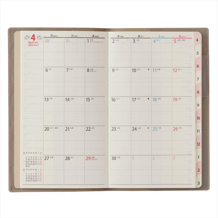 カレンダー感覚で1ヶ月の予定が把握でき、見たいページをパッと開けるインデックス付きです。