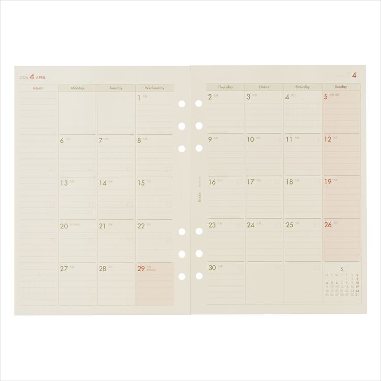 - 2026年3月始まりシステム手帳用リフィル A5 月間ダイアリー2 カレンダータイプ