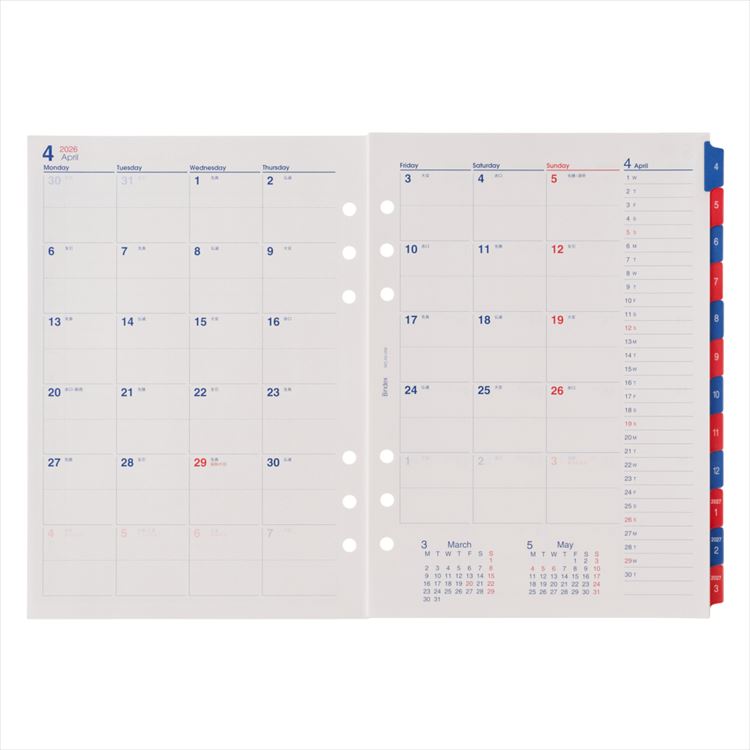 2026年4月始まりシステム手帳用リフィル A5 月間ダイアリー3 カレンダータイプ/インデックス付