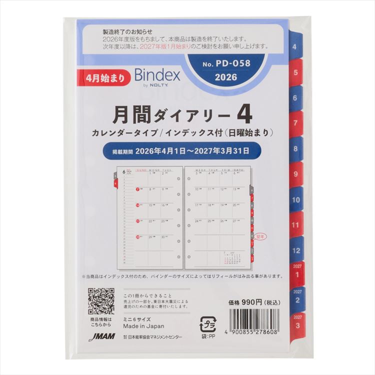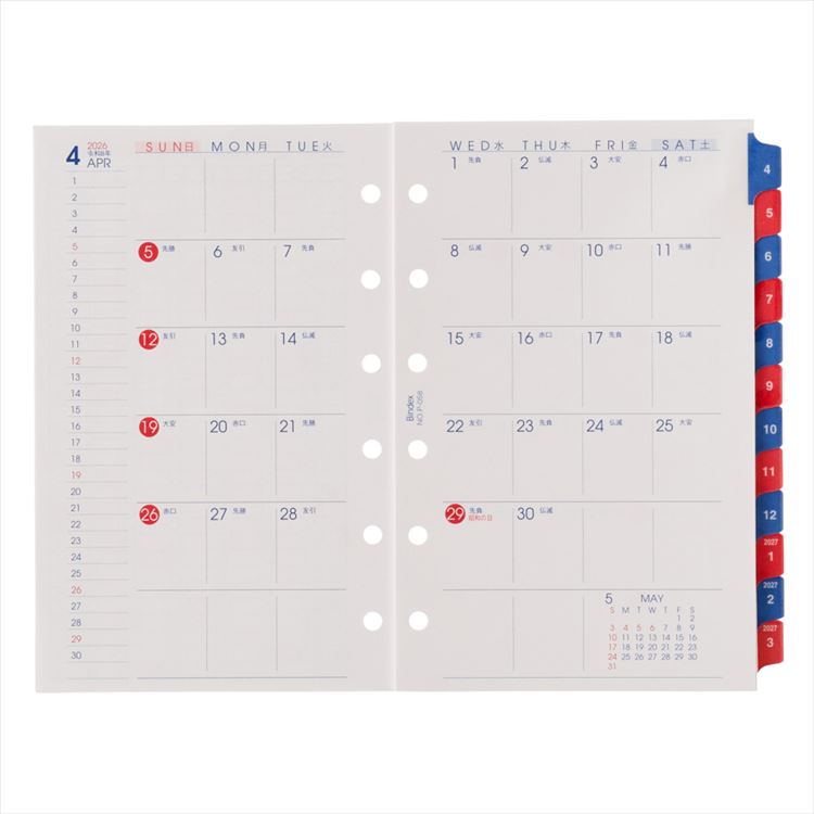 2026年4月始まりシステム手帳用リフィル ミニ6 月間ダイアリー4 カレンダータイプ/インデックス付 日曜始まり