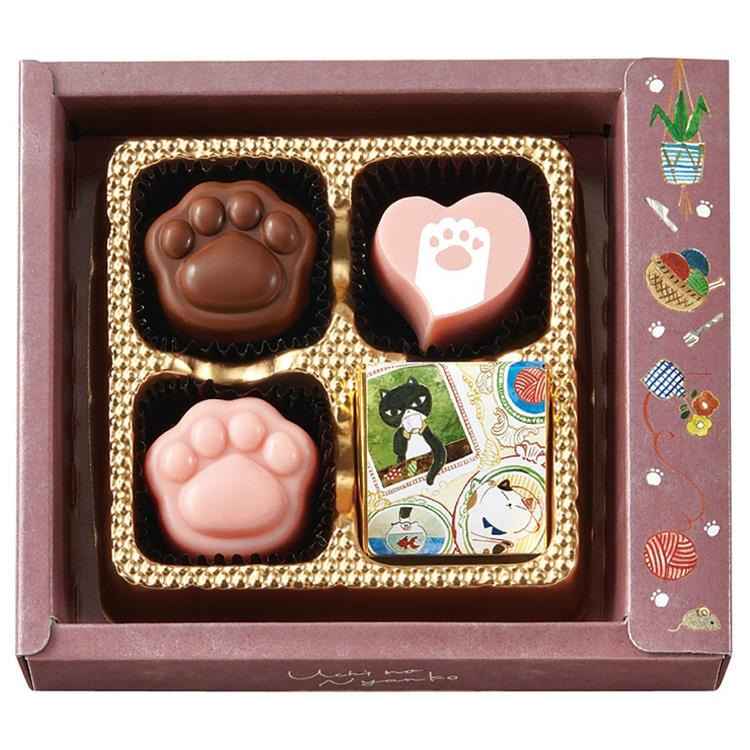 おしゃれな額縁をテーマにしたにゃんこのパッケージに、ミルクとストロベリーの肉球やハート型のチョコレートを詰めました。