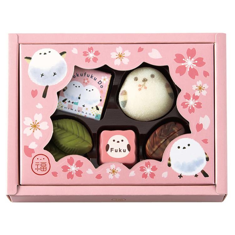 桜とシマエナガが描かれた華やかなボックスの中に、シマエナガゼリーやプリントチョコ、羽型チョコなどを詰めました。