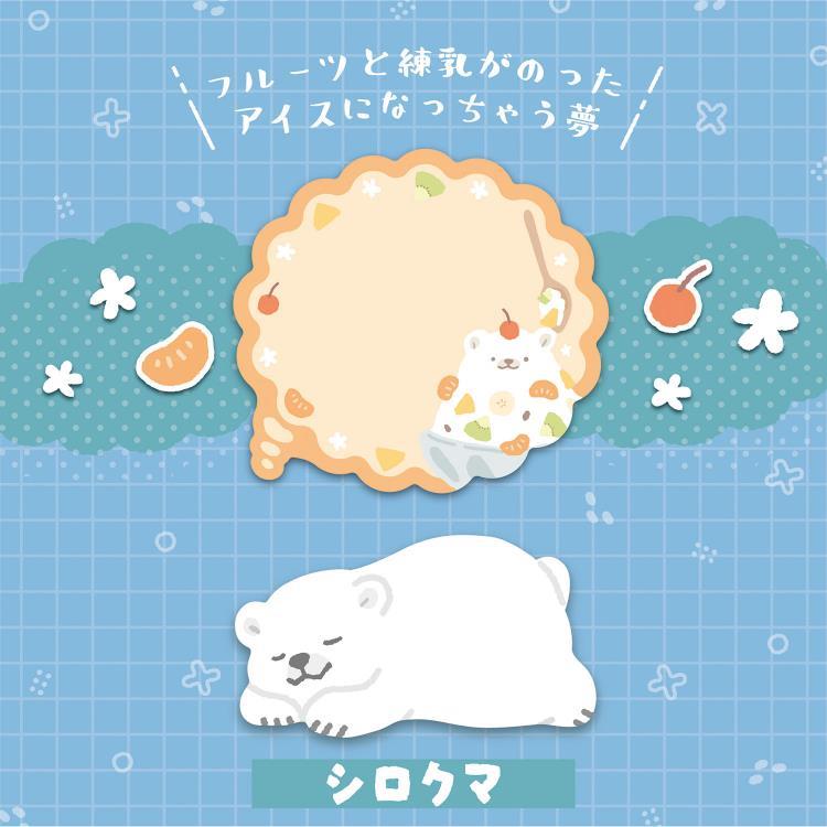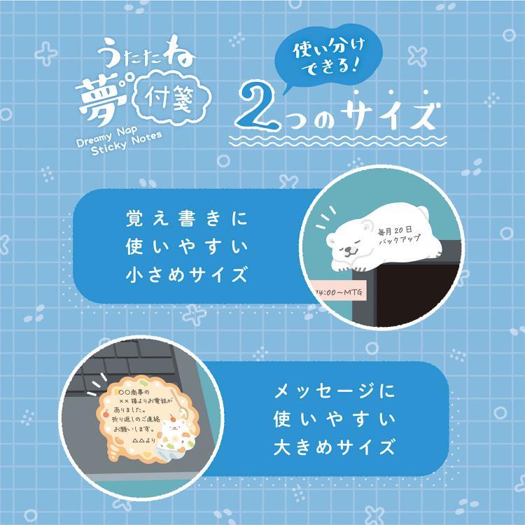 眠たげな表情の動物とふわふわした夢のかたちを組み合わせた、使い分けできる2サイズの付箋です。