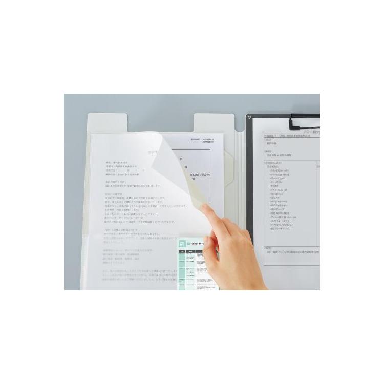 片手でも書類の出し入れがしやすいポケット形状。記入したい書類と閲覧したい書類を見開きで確認できます。