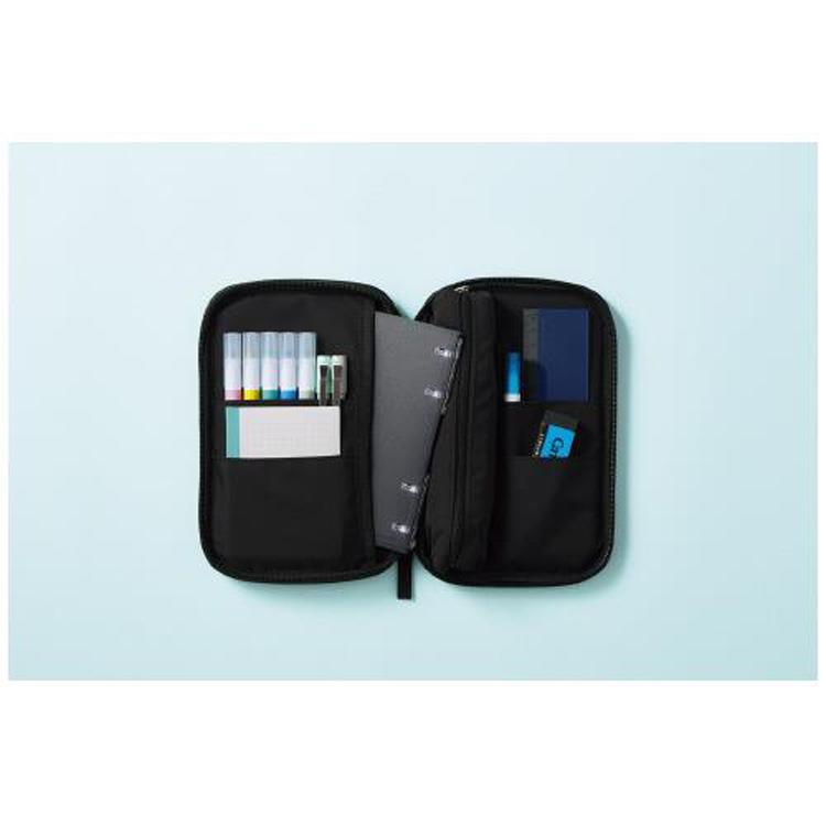 A6サイズのノートやバインダーが収まるポケット付きで、文具とあわせて持ち歩きたいアイテムをまとめられます。