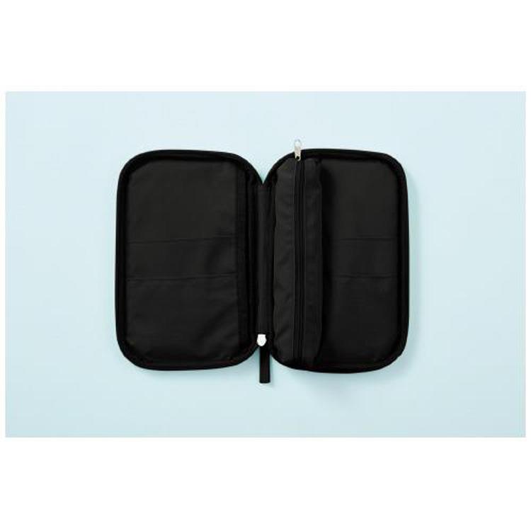 内側には複数のポケットを備え、ペンや付箋、メモ帳などを整理しながら収納できます。