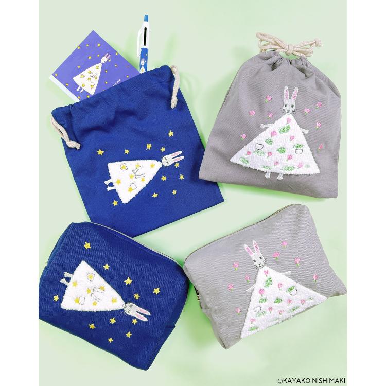 手触りの良いふわふわの刺繍が特徴の「サガラ刺繍」でキャラクターを表現した巾着です。