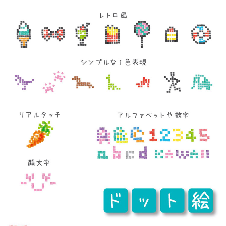 スタンプみたいにポンっと押してドット絵を楽しめます。四角マーカーの逆側には細字ペンがあり、文字や細かい線がキレイに書けます。