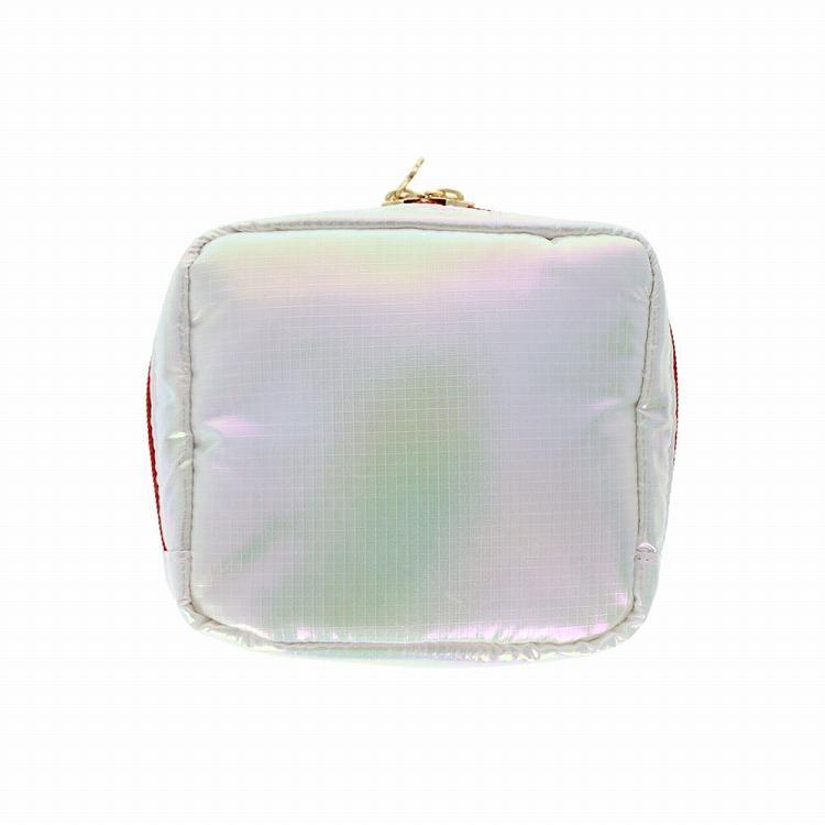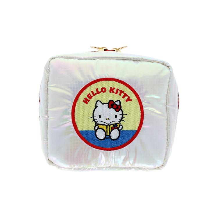 キラキラ輝く生地に、派手でかわいいハローキティの刺繍が存在感抜群のスクエアポーチ。