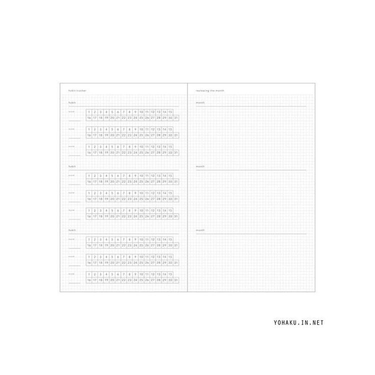 巻末付録には目標を記録して実行できたか毎日チェックできるハビットトラッカーと、良かったことや反省を書きこんで次の月に活かせる『ひと月ごとの振り返りページ』があります。