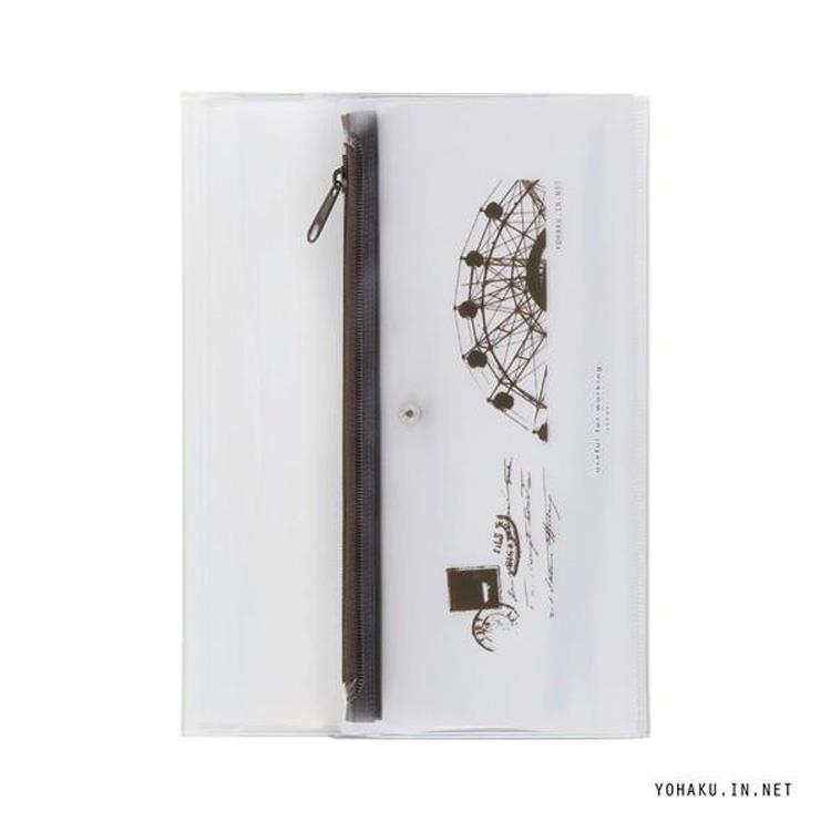 ノートや手帳といっしょに、文具や書類をまとめて持ち運べる、ロフト限定デザインのA5サイズペンケース付きカバー。