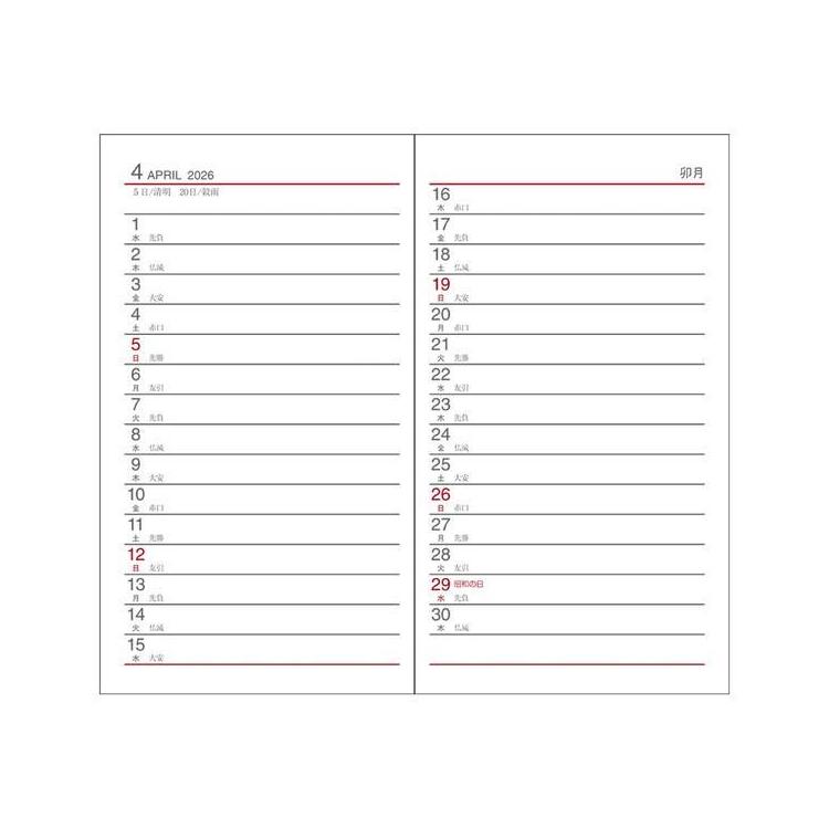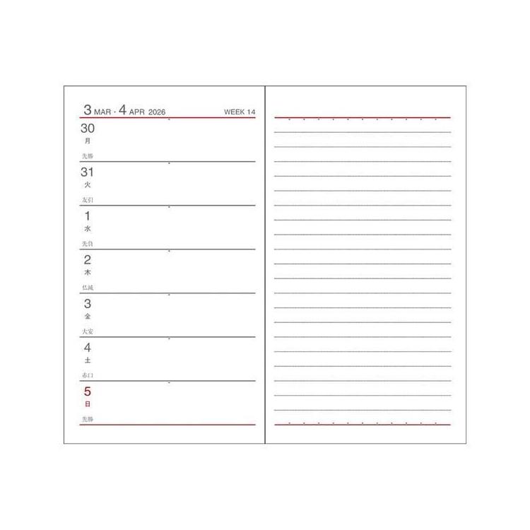1週間の予定を見ながらメモが書ける1週間+横罫メモのレイアウト。週の予定が見開きで管理できる人気のレイアウトです。書きたいときにすぐメモできる便利な鉛筆付き。