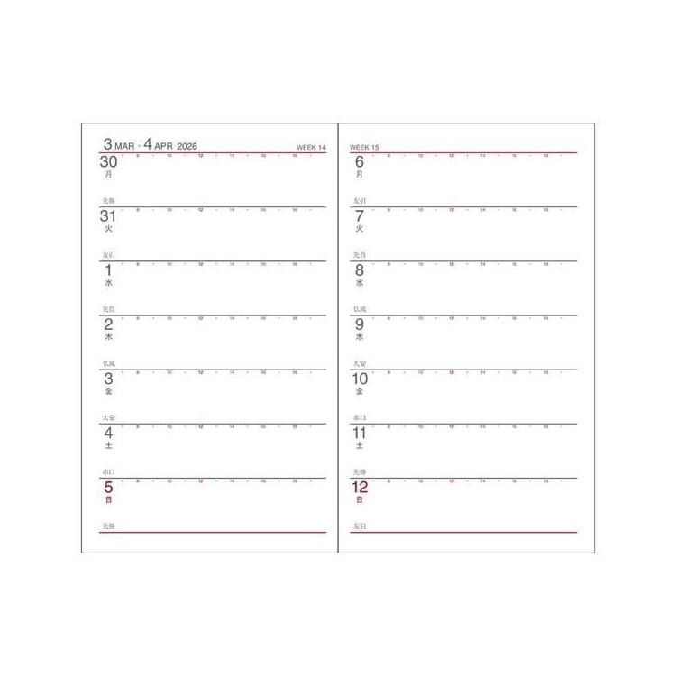 長期の予定を計画するのに便利な見開き2週間レイアウト。1日に書く量が少ない方や、先の予定まで管理しておきたい人におすすめです。