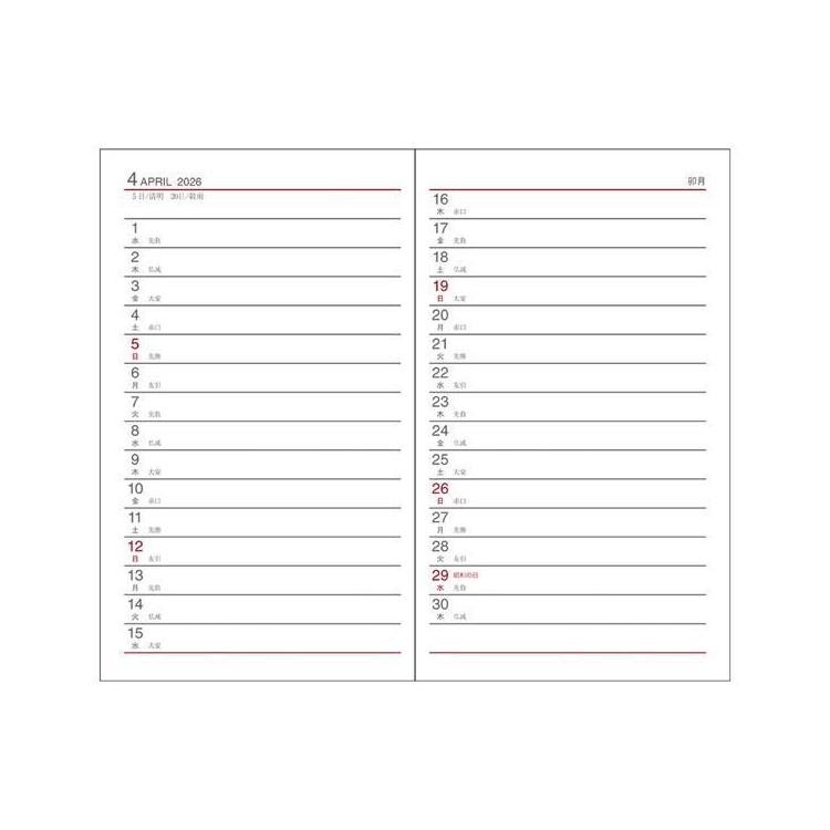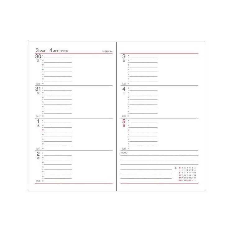 メモは少なめで1日の記入欄が広い見開き1週間レイアウト。表紙中身一体型なのでスッキリと持つことができます。