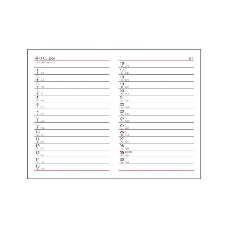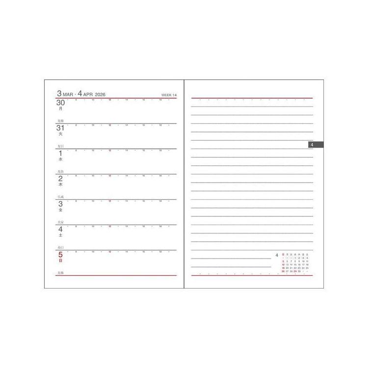左半分が1週間のスケジュール、右半分が横罫のメモスペースになっており1週間の予定とメモを見開きで管理できる人気のレイアウトです。コンパクトサイズで表紙中身一体型なのでスッキリと持つことができます。