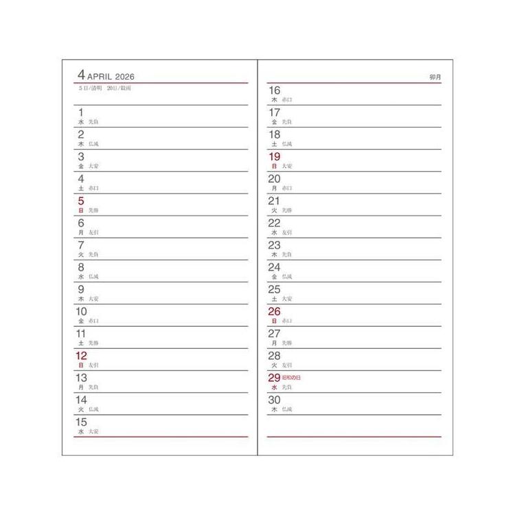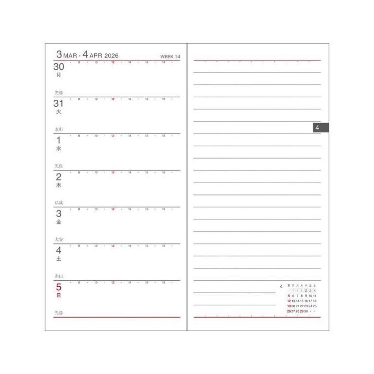 左半分が1週間のスケジュール、右半分が横罫のメモスペースになっており1週間の予定とメモを見開きで管理できる人気のレイアウトです。1週間の予定をざっくり把握したい、フリースペースにメモを取りたい人におすすめです。スリムサイズなので持ち運びにも便利です。