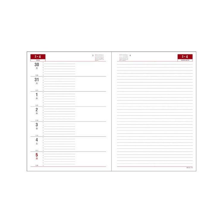 左半分が1週間のスケジュール、右半分が横罫のメモスペースになっており1週間の予定とメモを見開きで管理できる人気のレイアウトです。1週間の予定をざっくり把握したい、フリースペースにメモを取りたい人におすすめです。