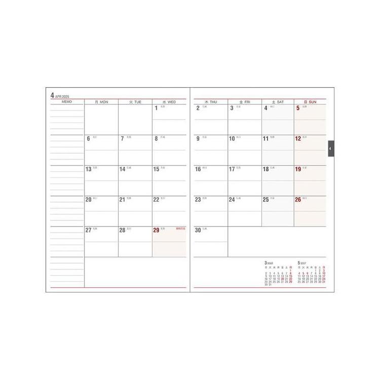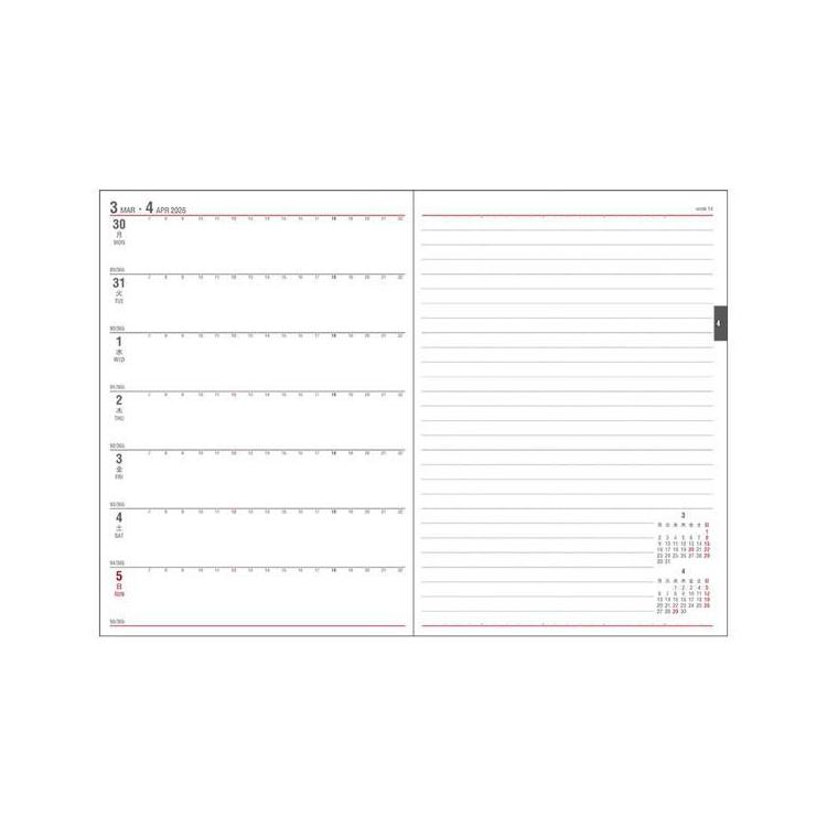 左半分が1週間のスケジュール、右半分が横罫のメモスペースになっており1週間の予定とメモを見開きで管理できる人気のレイアウトです。1週間の予定をざっくり把握したい、フリースペースにメモを取りたい人におすすめです。