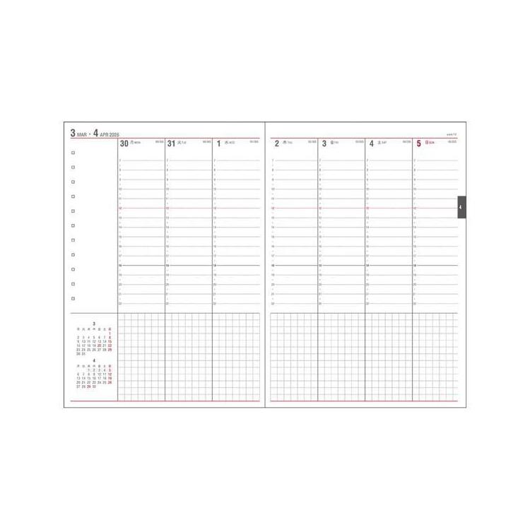 縦に時間ごとの目盛りが用意されたバーチカルレイアウト。時間を細かく区切って管理しやすいのが特徴で、仕事で時間刻みのアポイントが入る営業職の方や、隙間時間を見つけて効率をあげたい方にもおすすめです。