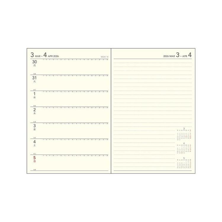 左半分が1週間のスケジュール、右半分が横罫のメモスペースになっており1週間の予定とメモを見開きで管理できる人気のレイアウトです。