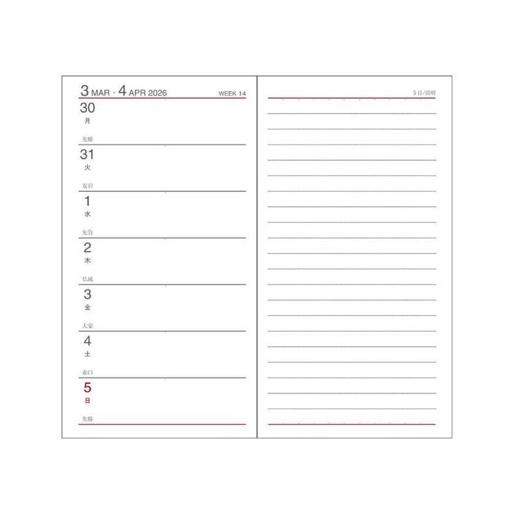 1週間の予定を見ながらメモが書ける1週間+横罫メモのレイアウト。週の予定が見開きで管理できる人気のレイアウトです。1週間の予定をざっくり把握したい人やフリースペースにメモをたくさん書きたい人におすすめです。こちらの商品はスモールサイズです。