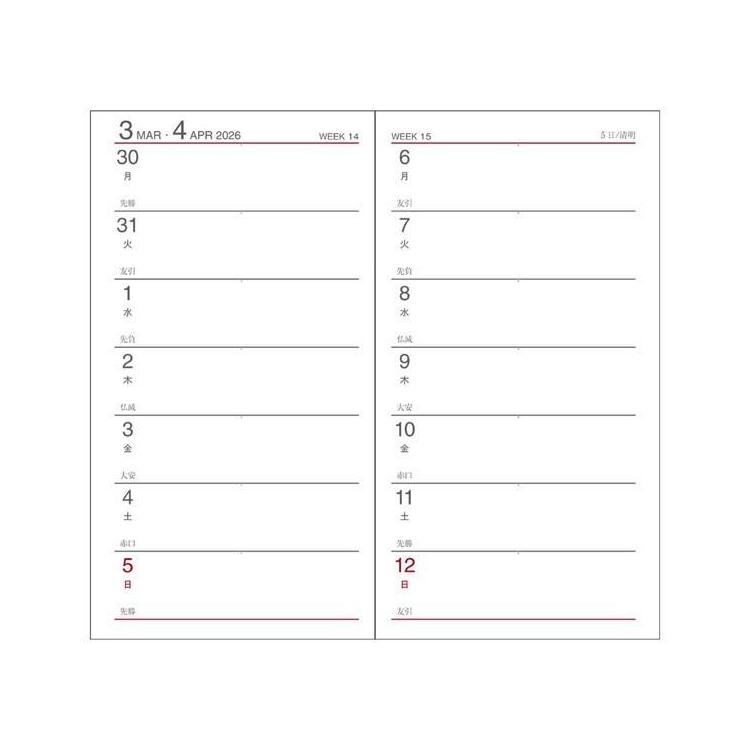 長期の予定を計画するのに便利な見開き2週間レイアウト。1日に書く量が少ない方や、先の予定まで管理しておきたい人におすすめです。こちらの商品はスモールサイズです。
