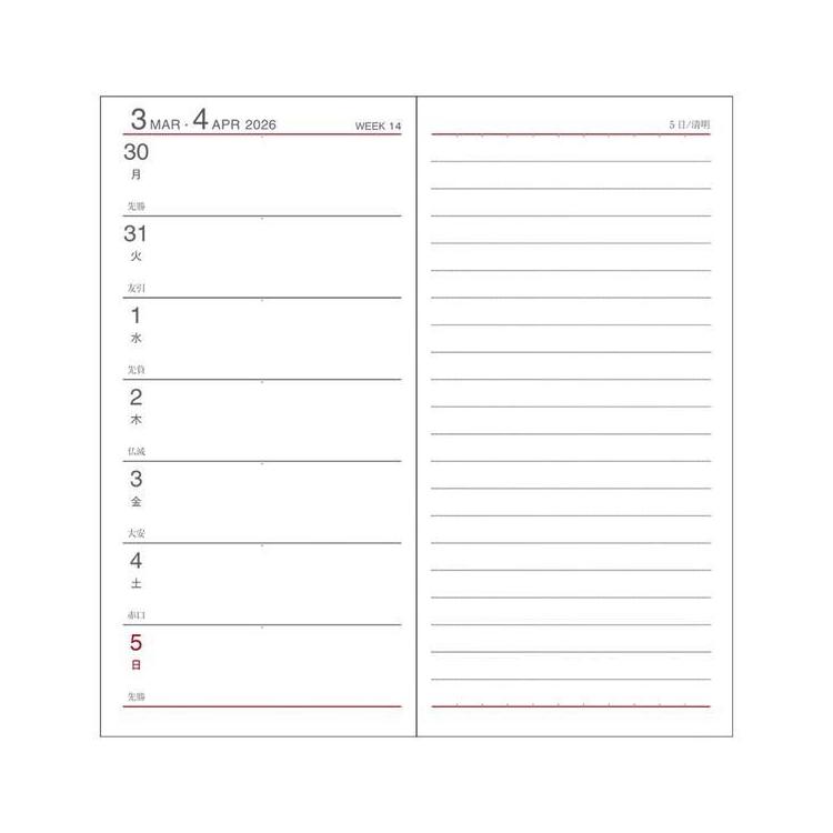 1週間の予定を見ながらメモが書ける1週間+横罫メモのレイアウト。週の予定が見開きで管理できる人気のレイアウトです。1週間の予定をざっくり把握したい人やフリースペースにメモをたくさん書きたい人におすすめです。こちらの商品はラージサイズです。