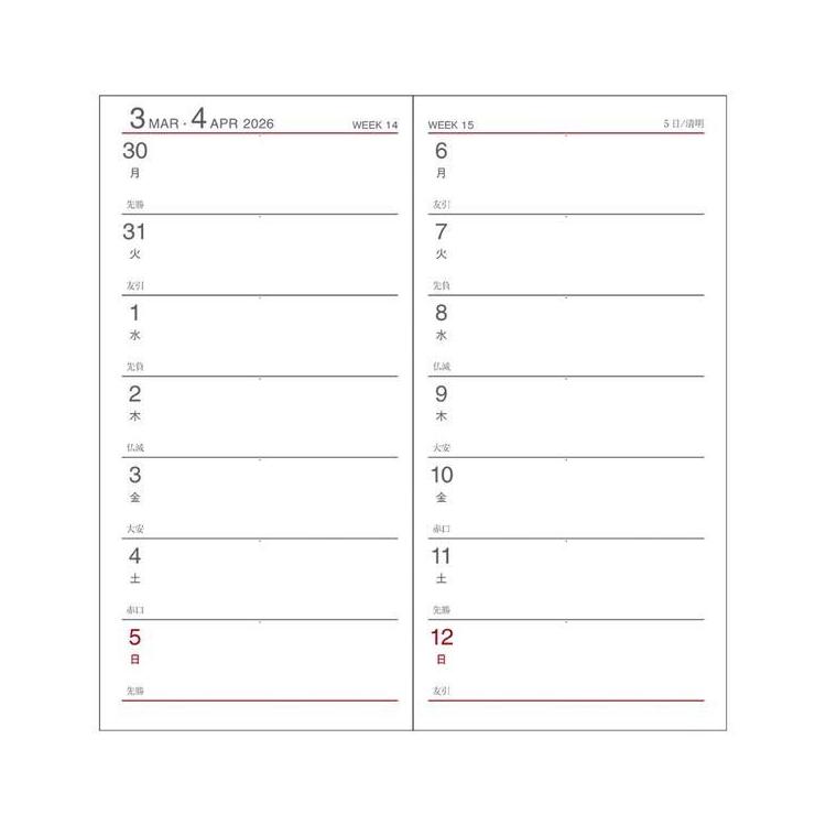 長期の予定を計画するのに便利な見開き2週間レイアウト。1日に書く量が少ない方や、先の予定まで管理しておきたい人におすすめです。こちらの商品はラージサイズです。