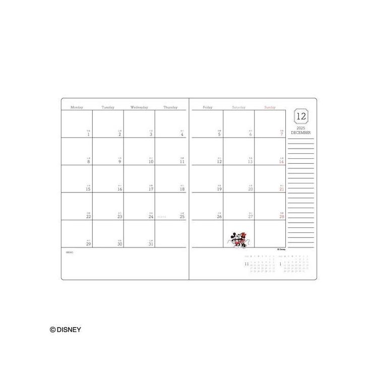 ミッキーと仲間たちがレイアウトされた、シンプルでビジネスシーンでも使いやすいデザイン。予定もメモもたっぷり書ける1週間+横罫のレイアウト。かわいい切り取りメモ付きです。