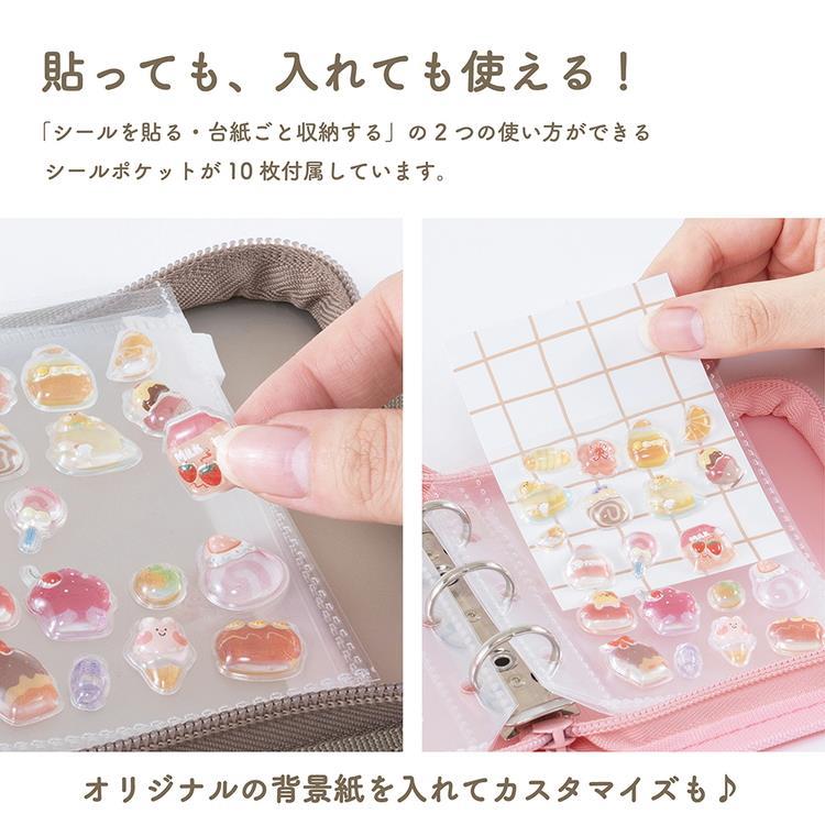 「シールを貼る・台紙ごと収納する」の2つの使い方ができる「シールポケット」が10枚と、ステッカーやフレークシールなどのバラバラした小物を入れられる「ファスナーポケット」が1枚付属しています。