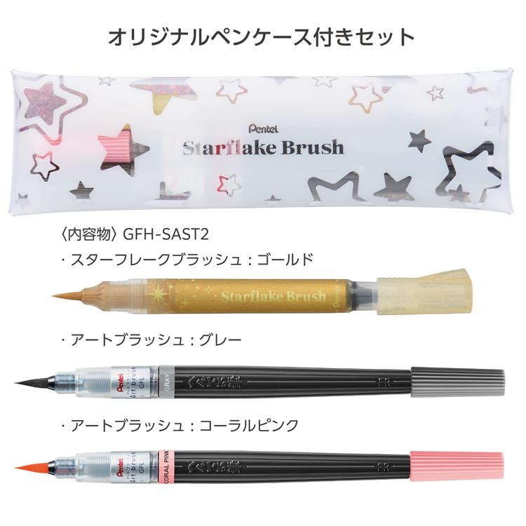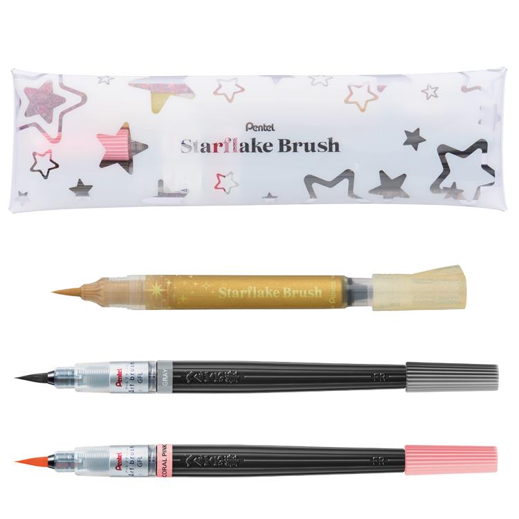 透明インキにグリッター顔料のみ入った限定筆ペン「Starflake Brush(スターフレークブラッシュ)」に、アートブラッシュ2本を組み合わせた限定スターターセットです。