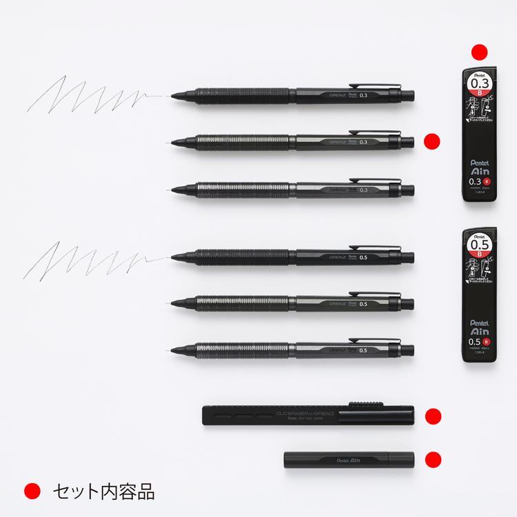 ・ホルダー式消しゴムは、ロゴ印字「CLIC ERASER for ORENZ」に、消しゴム本体の色を黒に統一した特別仕様。