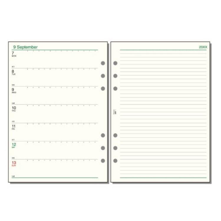 片面1週間、時間目盛付+横罫ノート、日付入、時間目盛付なので時間ごとのスケジュール管理がしやすくなっています。