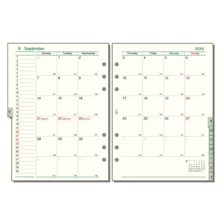 見開き両面1ヶ月ブロック式、月曜始まり インデックス付き。