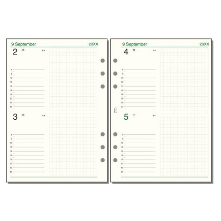 1ページ2日間、時間目盛付 日付入、1日あたりの書き込みスペースが適度に広く、記録を詳細に残せます。